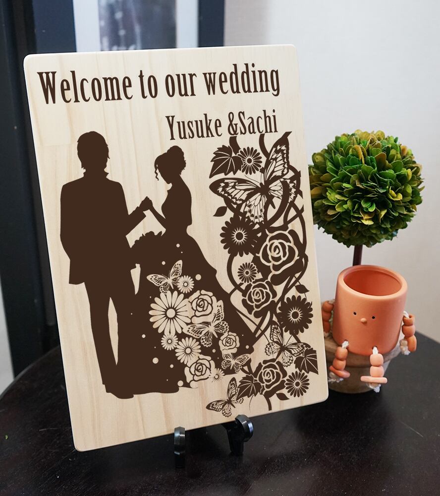 (サンプルの「Welcome tou our wedding」「Yusuke&Sachi」の部分です。漢字・カタカナ・ひらがなOKです)