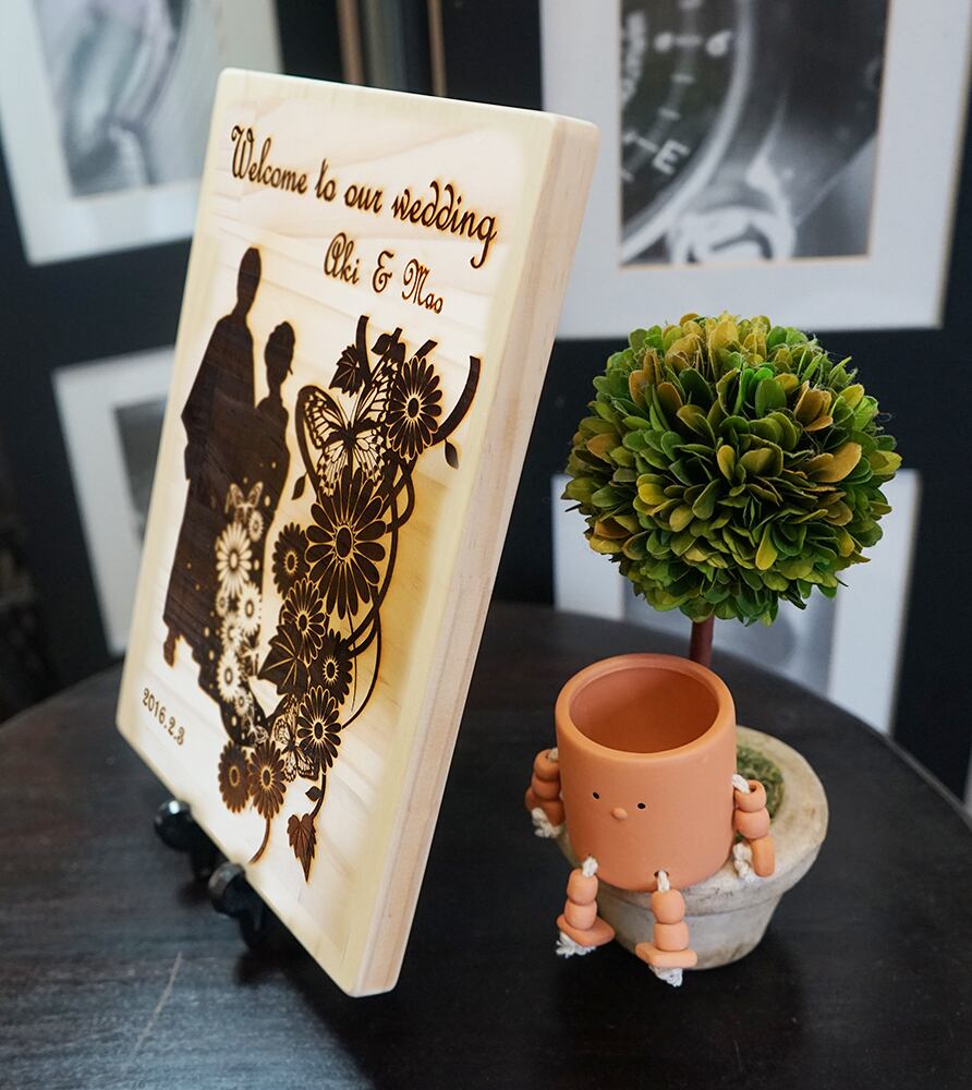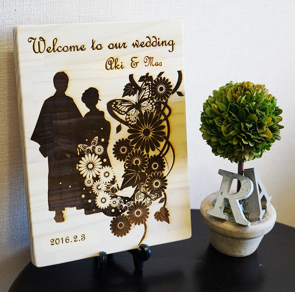 **切り絵を思わせる、お花を沢山あしらった華やかかつシックなデザインを目指しました。木目が美しい木のウェルカムボードです♪**