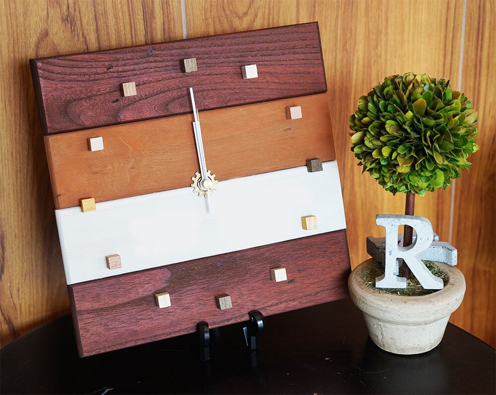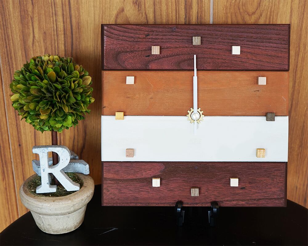 ○3色の色が違う板を合わせたアンティークな一品です。オーク(2枚使用)、チーク、ホワイトのトリコカラー仕上げ。大人っぽくもあり、個性的でもある優れものの時計です☆