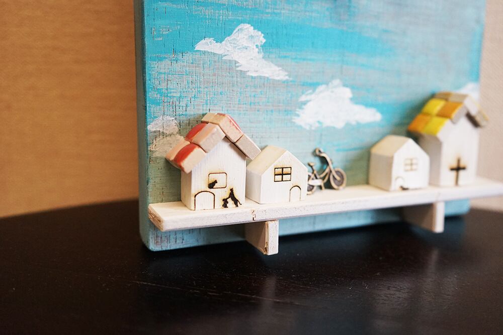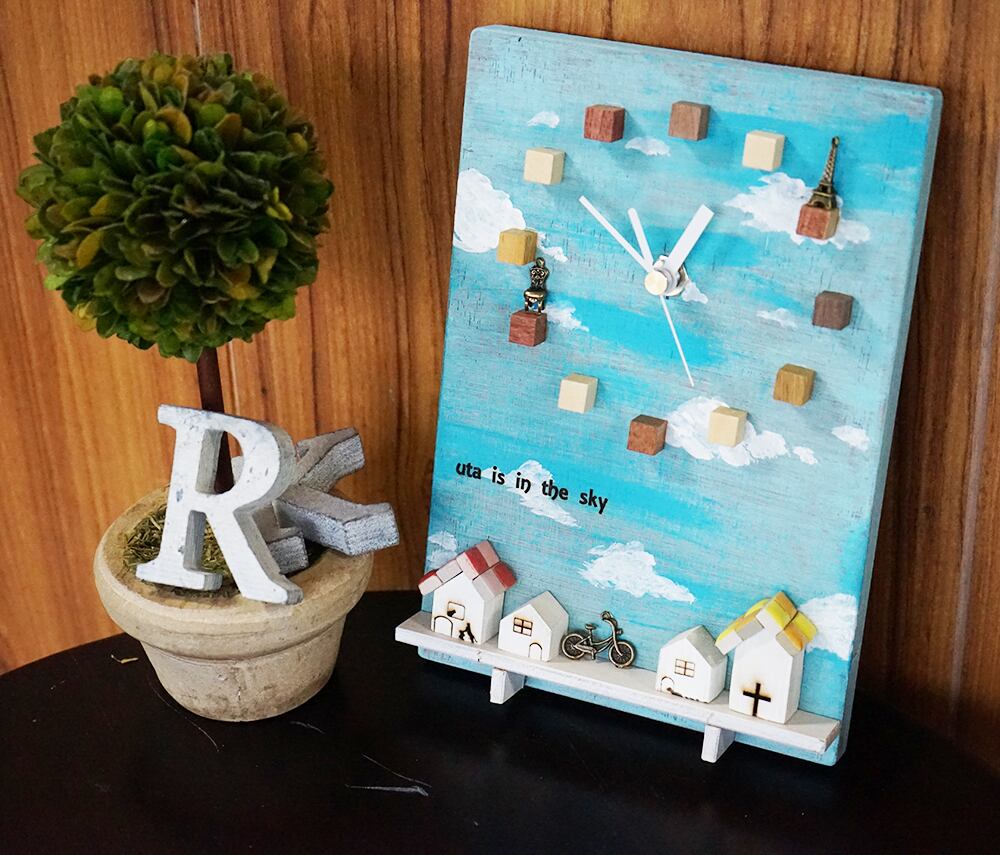 *アンティークな風合いを出したくて、シャビー加工で仕上げました。不規則に浮かぶ雲に、白いお家が何とも言えない雰囲気を感じる木製の時計です。