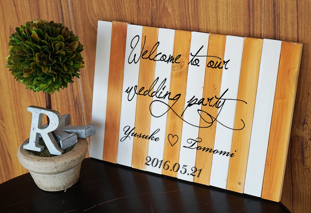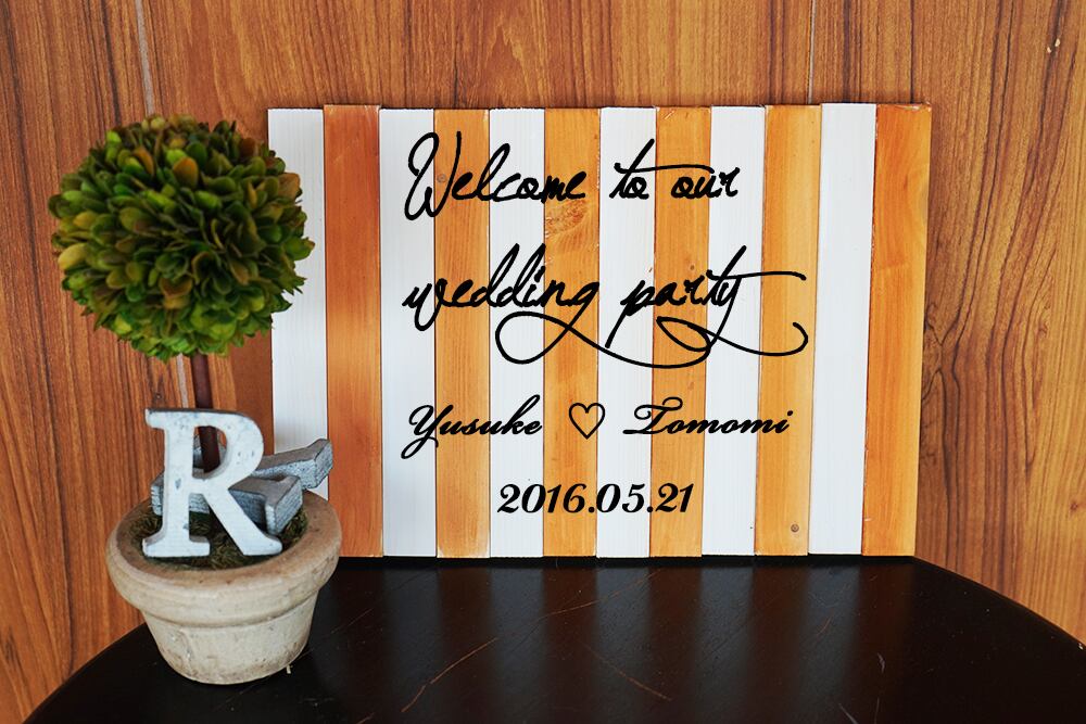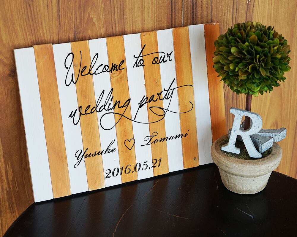 **自然派のナチュラルテイストの挙式にぴったりの木製ウェルカムボード・バイカラー(2色)verを作りました。アンティークかつPOPな仕上がりです**